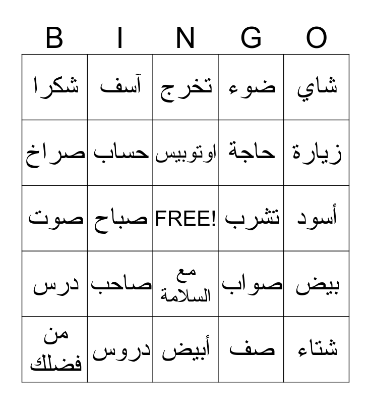 This bingo card has a free space and 24 words: صاحب, دروس, اوتوبيس, من فضلك, شاي, شكرا, صراخ, آسف, تشرب, مع السلامة, حاجة, صوت, صواب, بيض, حساب, صف, أسود, تخرج, زيارة, صباح, شتاء, درس, ضوء and أبيض.