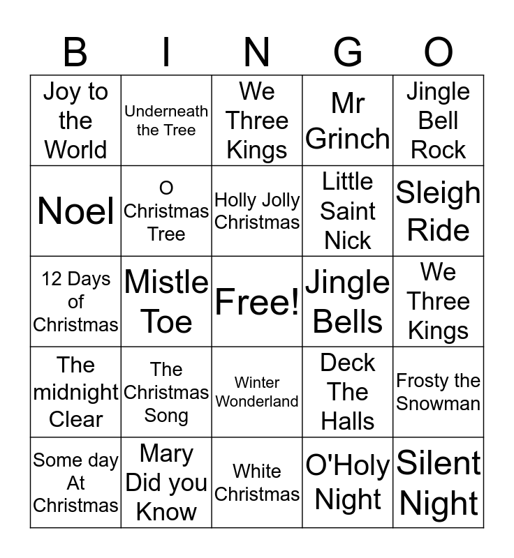 This bingo card has a free space and 31 words: White Christmas, Santa Baby, Mistle Toe, The First Noel, Joy to the World, We Three Kings, O Christmas Tree, Deck The Halls, Jingle Bells, O'Holy Night, We Three Kings, Silent Night, Feliz Navidad, Away in a Manger, Sleigh Ride, Blue Christmas, Frosty the Snowman, The Christmas Song, The midnight Clear, Winter Wonderland, Jingle Bell Rock, This Christmas, Some day At Christmas, Underneath the Tree, Little Saint Nick, Noel, Mr Grinch, 12 Days of Christmas, Mary Did you Know, Holly Jolly Christmas and Baby its cold Outside.