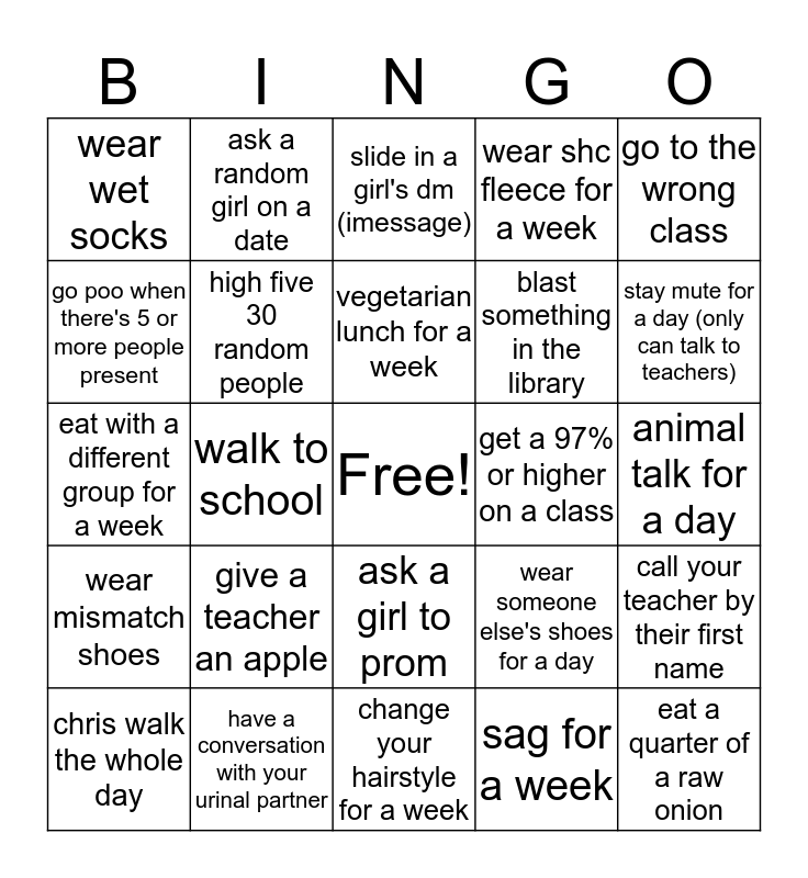 This bingo card has a free space and 24 words: give a teacher an apple, have a conversation with your urinal partner, vegetarian lunch for a week, chris walk the whole day, go to the wrong class, wear wet socks, go poo when there's 5 or more people present, ask a random girl on a date, get a 97% or higher on a class, ask a girl to prom, blast something in the library, eat with a different group for a week, wear someone else's shoes for a day, call your teacher by their first name, high five 30 random people, sag for a week, animal talk for a day, slide in a girl's dm (imessage), stay mute for a day (only can talk to teachers), walk to school, eat a quarter of a raw onion, wear mismatch shoes, wear shc fleece for a week and change your hairstyle for a week.