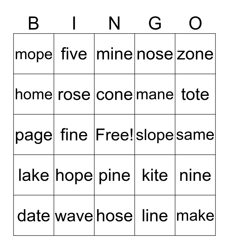 This bingo card has a free space and 65 words: hide, ride, side, wide, dive, hive, five, drive, kite, bite, home, dome, bone, zone, phone, rose, cone, nose, rope, mope, hope, hose, slope, mole, hole, pole, nope, vote, tote, cave, wave, note, vase, case, page, cage, save, line, nine, vine, fine, pine, bike, hike, like, mike, mine, cake, make, lake, snake, bake, name, same, fame, cane, game, mane, gate, date, late, lane, tape, grape and cape.