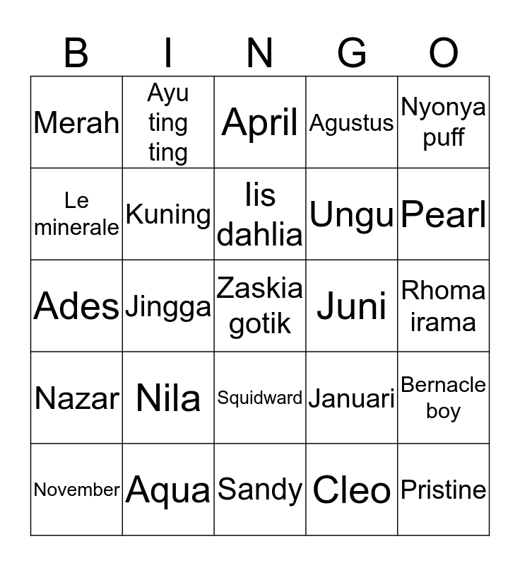 This bingo card has a free space and 24 words: Nila, Aqua, Iis dahlia, November, Nyonya puff, Merah, Le minerale, Ayu ting ting, Juni, Squidward, Ungu, Ades, Januari, Bernacle boy, Kuning, Cleo, Rhoma irama, April, Pearl, Jingga, Pristine, Nazar, Agustus and Sandy.