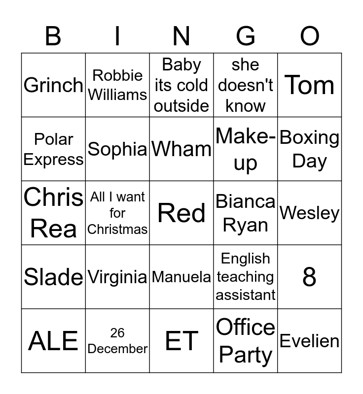 This bingo card has a free space and 40 words: 21 October 2019, Chris Rea, 4,7, Sophia, 26 December, Manuela, Wham, Chantal, Tom, Slade, All I want for Christmas, she doesn't know, Evelien, Wesley, Bianca Ryan, Virginia, Mary, Grinch, Bing Crosby, Baby its cold outside, 8, Office Party, Make-up, Polar Express, Last Christmas, The night before Christmas, Busy, More, Fore- woman, 5, AGM, ALE, 16 May 2020, English teaching assistant, Boxing Day, ET, You get kissed, Home Alone, Robbie Williams and One horse open Sleigh.