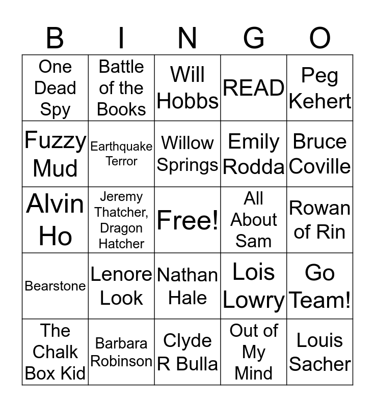 This bingo card has a free space and 29 words: The Chalk Box Kid, Sharon M. Draper, Jeremy Thatcher, Dragon Hatcher, Sharon Creech, One Dead Spy, Will Hobbs, Earthquake Terror, Lenore Look, All About Sam, Barbara Robinson, Rowan of Rin, Louis Sacher, Clyde R Bulla, Out of My Mind, Bruce Coville, Moo, Nathan Hale, Bearstone, Peg Kehert, Alvin Ho, Lois Lowry, The Best School Year Ever, Emily Rodda, Fuzzy Mud, READ, Battle of the Books, Go Team!, Willow Springs and Canyons School District.