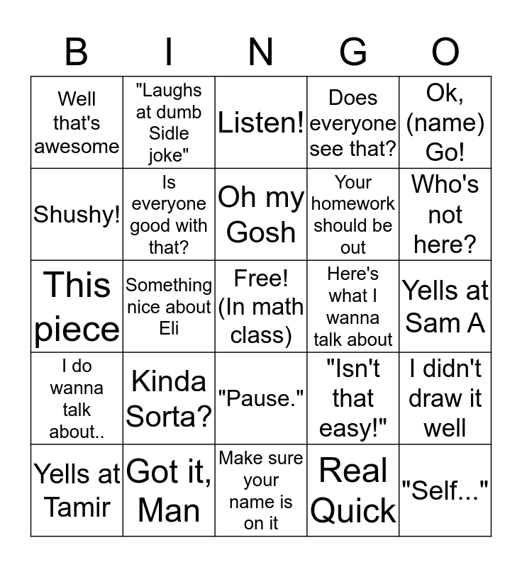This bingo card has a free space and 24 words: Kinda Sorta?, Got it, Man, Oh my Gosh, Yells at Tamir, Ok,(name) Go!, Well that's awesome, Shushy!, "Laughs at dumb Sidle joke", Here's what I wanna talk about, "Pause.", Your homework should be out, This piece, "Isn't that easy!", I didn't draw it well, Is everyone good with that?, Real Quick, Yells at Sam A, Listen!, Who's not here?, Something nice about Eli, "Self...", I do wanna talk about.., Does everyone see that? and Make sure your name is on it.