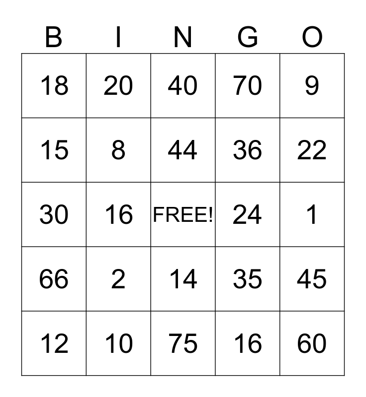 This bingo card has a free space and 24 words: 2, 10, 44, 12, 9, 18, 15, 20, 24, 14, 36, 30, 35, 45, 8, 16, 1, 40, 22, 16, 60, 66, 70 and 75.
