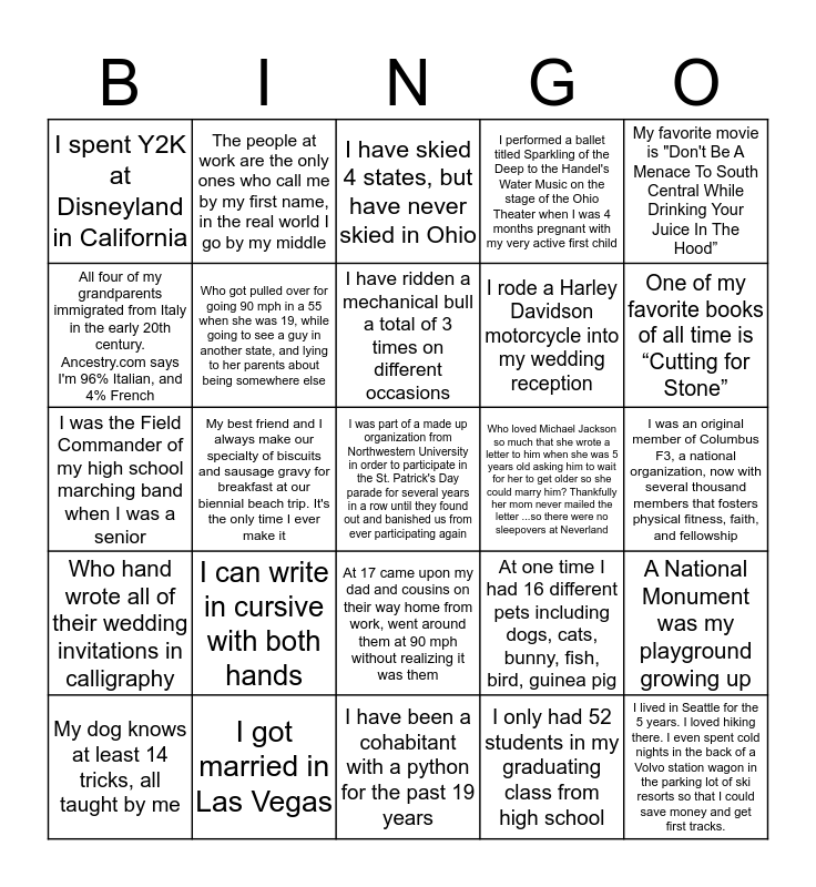 This bingo card has 25 words: I can write in cursive with both hands, I have been a cohabitant with a python for the past 19 years, I have ridden a mechanical bull a total of 3 times on different occasions, My dog knows at least 14 tricks, all taught by me, My favorite movie is "Don't Be A Menace To South Central While Drinking Your Juice In The Hood”, I spent Y2K at Disneyland in California, All four of my grandparents immigrated from Italy in the early 20th century. Ancestry.com says I'm 96% Italian, and 4% French, The people at work are the only ones who call me by my first name, in the real world I go by my middle, Who loved Michael Jackson so much that she wrote a letter to him when she was 5 years old asking him to wait for her to get older so she could marry him? Thankfully her mom never mailed the letter ...so there were no sleepovers at Neverland, At 17 came upon my dad and cousins on their way home from work, went around them at 90 mph without realizing it was them, I rode a Harley Davidson motorcycle into my wedding reception, I was the Field Commander of my high school marching band when I was a senior, At one time I had 16 different pets including dogs, cats, bunny, fish, bird, guinea pig, A National Monument was my playground growing up, Who got pulled over for going 90 mph in a 55 when she was 19, while going to see a guy in another state, and lying to her parents about being somewhere else, I lived in Seattle for the 5 years. I loved hiking there. I even spent cold nights in the back of a Volvo station wagon in the parking lot of ski resorts so that I could save money and get first tracks., I was an original member of Columbus F3, a national organization, now with several thousand members that fosters physical fitness, faith, and fellowship, I have skied 4 states, but have never skied in Ohio, One of my favorite books of all time is “Cutting for Stone”, My best friend and I always make our specialty of biscuits and sausage gravy for breakfast at our biennial beach trip. It's the only time I ever make it, I was part of a made up organization from Northwestern University in order to participate in the St. Patrick's Day parade for several years in a row until they found out and banished us from ever participating again, I got married in Las Vegas, Who hand wrote all of their wedding invitations in calligraphy, I performed a ballet titled Sparkling of the Deep to the Handel's Water Music on the stage of the Ohio Theater when I was 4 months pregnant with my very active first child and I only had 52 students in my graduating class from high school.