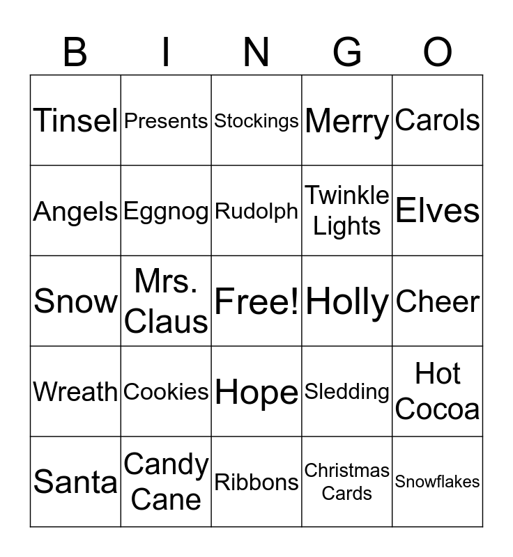 This bingo card has a free space and 24 words: Cookies, Candy Cane, Rudolph, Santa, Carols, Tinsel, Angels, Presents, Holly, Hope, Twinkle Lights, Snow, Sledding, Hot Cocoa, Eggnog, Christmas Cards, Cheer, Stockings, Elves, Mrs. Claus, Snowflakes, Wreath, Merry and Ribbons.