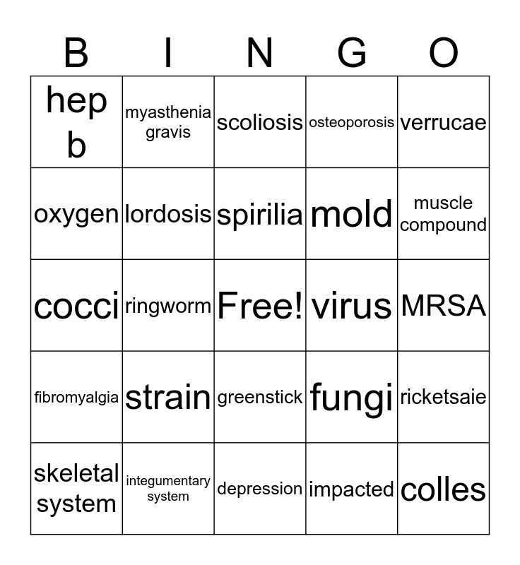 This bingo card has a free space and 29 words: skeletal system, pathogen, ringworm, bacteria, hep b, scoliosis, lordosis, strain, virus, integumentary system, MRSA, colles, depression, impacted, muscle compound, anatomical position, greenstick, fibromyalgia, verrucae, cocci, fungi, yeast, mold, oxygen, osteoporosis, myasthenia gravis, ricketsaie, spirilia and eczema.