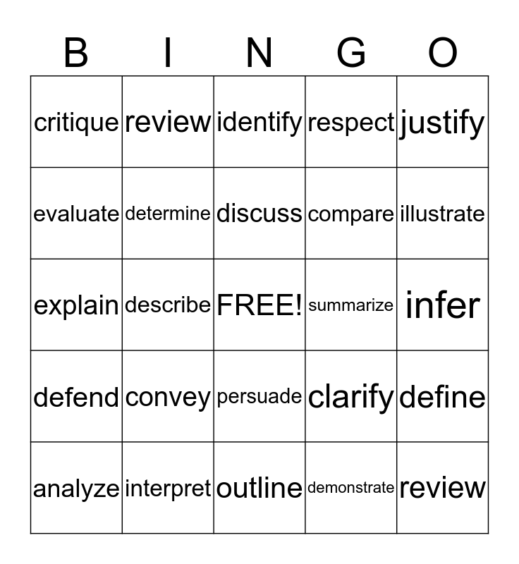 This bingo card has a free space and 24 words: convey, interpret, discuss, analyze, justify, critique, evaluate, review, summarize, persuade, compare, explain, clarify, define, determine, demonstrate, infer, identify, illustrate, describe, review, defend, respect and outline.