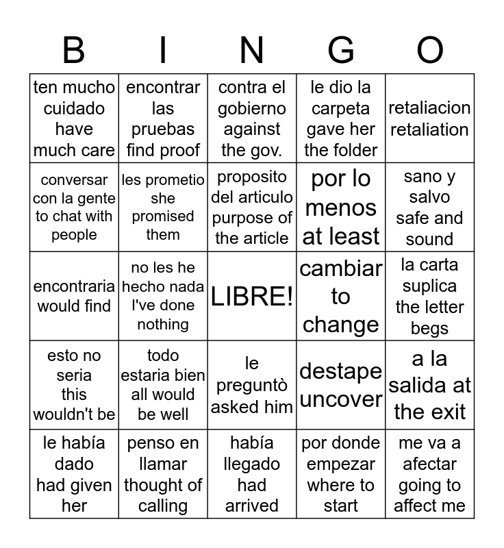 This bingo card has a free space and 28 words: a la salida at the exit, un plan secreto a secret plan, por lo menos at least, por donde empezar where to start, conversar con la gente to chat with people, contra el gobierno against the gov., encontrar las pruebas find proof, esto no seria this wouldn't be, cambiar to change, le había dado had given her, encontraria would find, le dio la carpeta gave her the folder, penso en llamar thought of calling, había llegado had arrived, sano y salvo safe and sound, les iba a pasar was going to happen, todo estaria bien all would be well, les prometio she promised them, proposito del articulo purpose of the article, le preguntò asked him, ten mucho cuidado have much care, sorpresa surprise, me va a afectar going to affect me, no les he hecho nada I've done nothing, la carta suplica the letter begs, destape uncover, retaliacion retaliation and estoy en peligro am I in danger.