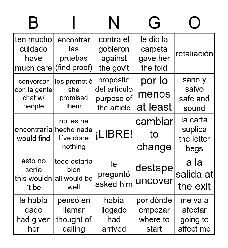 This bingo card has a free space and 28 words: a la salida at the exit, un plan secreto a secret plan, por lo menos at least, por dónde empezar where to start, conversar con la gente chat w/ people, contra el gobieron against the gov't, encontrar las pruebas (find proof), esto no sería this wouldn´t be, cambiar to change, le había dado had given her, encontraría would find, le dio la carpeta gave her the fold, pensó en llamar thought of calling, había llegado had arrived, sano y salvo safe and sound, les iba a pasar was going to happen, todo estaría bien all would be well, les prometió she promised them, propósito del artículo purpose of the article, le preguntó asked him, ten mucho cuidado have much care, sorpresa surprise, me va a afectar going to affect me, no les he hecho nada I´ve done nothing, la carta suplica the letter begs, destape uncover, retaliación and ¿Estoy en peligro? Am I in danger.