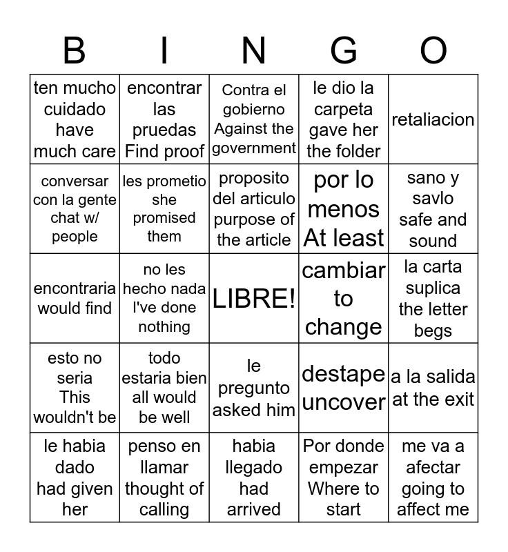 This bingo card has a free space and 28 words: a la salida at the exit, un plan secreto a secret plan, por lo menos At least, Por donde empezar Where to start, conversar con la gente chat w/ people, Contra el gobierno Against the government, encontrar las pruedas Find proof, esto no seria This wouldn't be, cambiar to change, le habia dado had given her, encontraria would find, le dio la carpeta gave her the folder, penso en llamar thought of calling, habia llegado had arrived, sano y savlo safe and sound, les iba a pasar was going to happen, todo estaria bien all would be well, les prometio she promised them, proposito del articulo purpose of the article, le pregunto asked him, ten mucho cuidado have much care, sorpresa surprise, me va a afectar going to affect me, no les hecho nada I've done nothing, la carta suplica the letter begs, destape uncover, retaliacion and estoy en peligro? Am I in danger?.