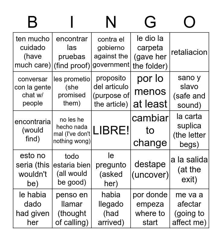 This bingo card has a free space and 28 words: a la salida (at the exit), un plan secreto (a secret plan), por lo menos at least, por donde empeza where to start, conversar con la gente chat w/ people, contra el gobierno against the government, encontrar las pruebas (find proof), esto no seria (this wouldn't be), cambiar to change, le habia dado had given her, encontraria (would find), le dio la carpeta (gave her the folder), penso en llamar (thought of calling), habia llegado (had arrived), sano y slavo (safe and sound), les iba a pasar (was going to happen), todo estaria bien (all would be good), les prometio (she promised them), proposito del articulo (purpose of the article), le pregunto (asked her), ten mucho cuidado (have much care), sopresa (surprise), me va a afectar (going to affect me), no les he hecho nada mal (I've don't nothing wong), la carta suplica (the letter begs), destape (uncover), retaliacion and Estoy en peligro? (Am I in danger?).