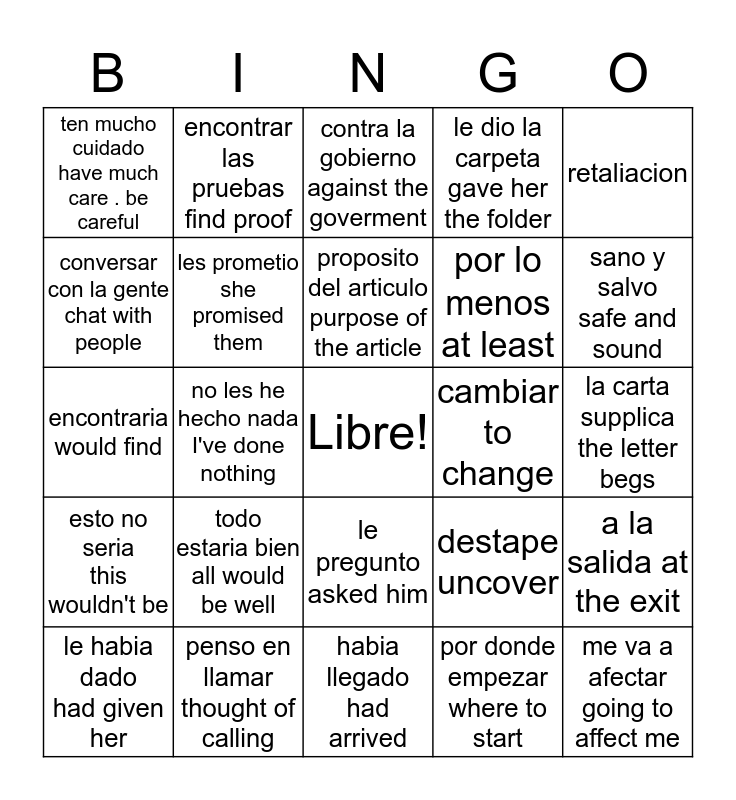 This bingo card has a free space and 28 words: a la salida at the exit, un plan secreto a secret plan, por lo menos at least, por donde empezar where to start, conversar con la gente chat with people, contra la gobierno against the goverment, encontrar las pruebas find proof, esto no seria this wouldn't be, cambiar to change, le habia dado had given her, encontraria would find, le dio la carpeta gave her the folder, penso en llamar thought of calling, habia llegado had arrived, sano y salvo safe and sound, les iba a pasar was going to happen, todo estaria bien all would be well, les prometio she promised them, proposito del articulo purpose of the article, le pregunto asked him, ten mucho cuidado have much care . be careful, sorpresa surprise, me va a afectar going to affect me, no les he hecho nada I've done nothing, la carta supplica the letter begs, destape uncover, retaliacion and estoy en peligro? am i in danger.