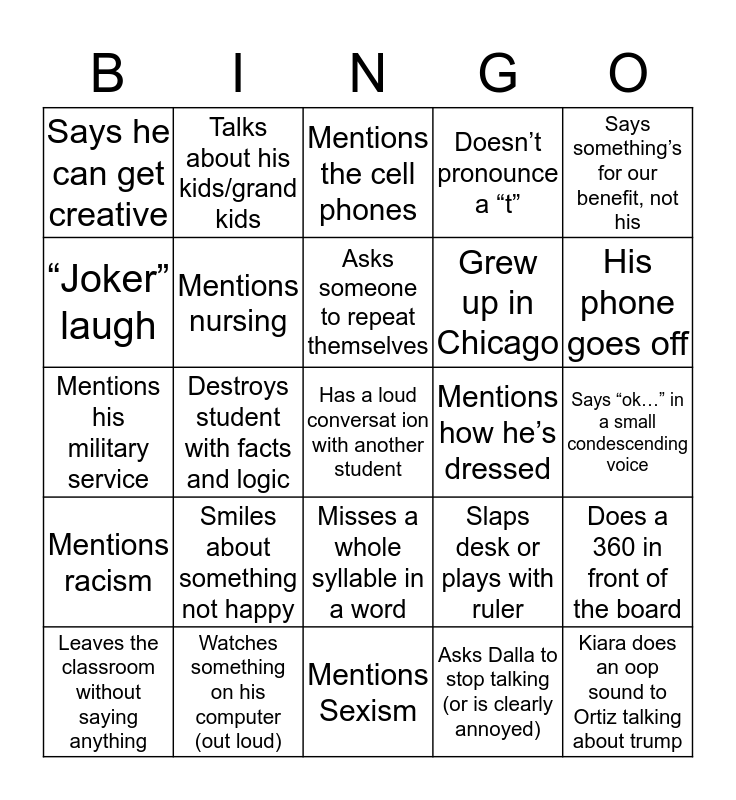 This bingo card has a free space and 24 words: Smiles about something not happy, Watches something on his computer (out loud), Asks someone to repeat themselves, Leaves the classroom without saying anything, Says something’s for our benefit, not his, Says he can get creative, “Joker” laugh, Talks about his kids/grand kids, Mentions how he’s dressed, Misses a whole syllable in a word, Grew up in Chicago, Mentions his military service, Slaps desk or plays with ruler, Does a 360 in front of the board, Mentions nursing, Asks Dalla to stop talking (or is clearly annoyed), Says “ok…” in a small condescending voice, Mentions the cell phones, His phone goes off, Destroys student with facts and logic, Kiara does an oop sound to Ortiz talking about trump, Mentions racism, Doesn’t pronounce a “t” and Mentions Sexism.