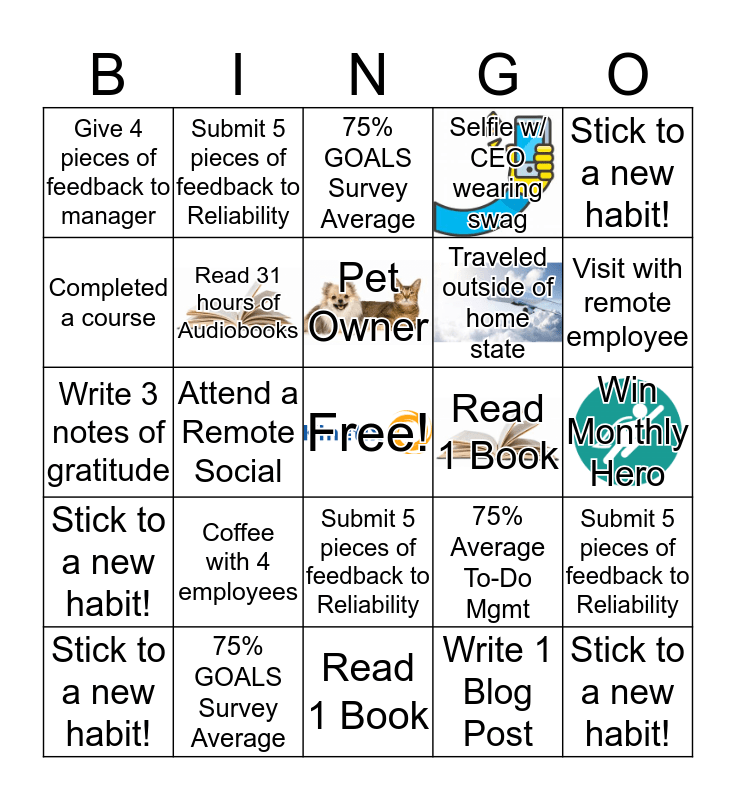This bingo card has 6 images, a free space and 24 words: Stick to a new habit!, Coffee with 4 employees, Pet Owner, Write 1 Blog Post, Stick to a new habit!, Give 4 pieces of feedback to manager, Submit 5 pieces of feedback to Reliability, 75% GOALS Survey Average, Read 1 Book, Win Monthly Hero, Write 3 notes of gratitude, Read 31 hours of Audiobooks, 75% Average To-Do Mgmt, Submit 5 pieces of feedback to Reliability, Completed a course, 75% GOALS Survey Average, Read 1 Book, Selfie w/ CEO wearing swag, Visit with remote employee, Stick to a new habit!, Attend a Remote Social, Submit 5 pieces of feedback to Reliability, Traveled outside of home state and Stick to a new habit!.