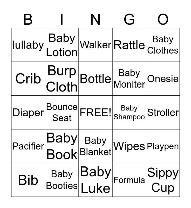 This bingo card has a free space and 24 words: Baby Book, Baby Booties, Bottle, Bib, Baby Clothes, lullaby, Crib, Baby Lotion, Baby Shampoo, Baby Blanket, Baby Moniter, Diaper, Wipes, Playpen, Burp Cloth, Formula, Stroller, Walker, Onesie, Bounce Seat, Sippy Cup, Pacifier, Rattle and Baby Luke.