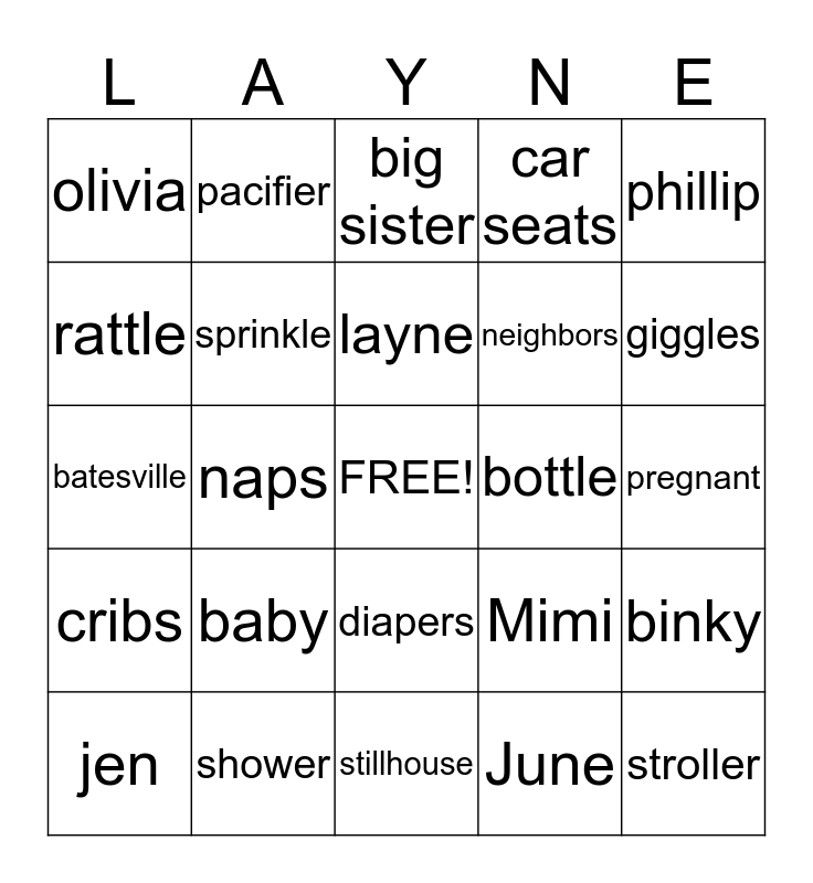 This bingo card has a free space and 24 words: baby, shower, layne, jen, phillip, olivia, rattle, pacifier, bottle, diapers, neighbors, batesville, Mimi, binky, sprinkle, June, pregnant, big sister, giggles, naps, stroller, cribs, car seats and stillhouse.