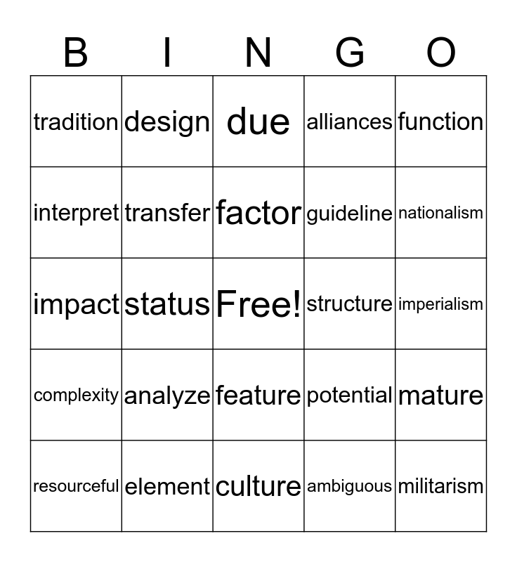 This bingo card has a free space and 24 words: analyze, element, factor, resourceful, function, tradition, interpret, design, structure, feature, guideline, impact, potential, mature, transfer, ambiguous, imperialism, due, nationalism, status, militarism, complexity, alliances and culture.