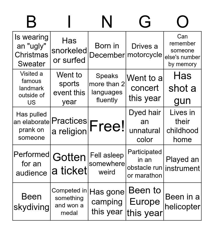 This bingo card has a free space and 43 words: Been in a band, Been in a helicopter, Been on radio or tv, Been skydiving, Been to Asia this year, Been to Europe this year, Born in December, Born outside of US, Can remember someone else's number by memory, Competed in something and won a medal, Drives a motorcycle, Dyed hair an unnatural color, Fell asleep somewhere weird, Gotten a ticket, Has a tattoo, Has gone camping this year, Has gotten stitches, Has pulled an elaborate prank on someone, Has regifted a gift, Has shot a gun, Has snorkeled or surfed, Has twins or is a twin, Is vegan, Is wearing an "ugly" Christmas Sweater, Lived in a different country, Lives in their childhood home, Owns a house, Participated in a play, Participated in an obstacle run or marathon, Performed for an audience, Played a team sport, Played an instrument, Practiced martial arts, Practices a religion, Prefers Star Trek over Star Wars, Prefers Star Wars over Star Trek, Ridden a horse, Speaks more than 2 languages fluently, Visited a famous landmark outside of US, Went to a concert this year, Went to a wedding this year, Went to sports event this year and Worked in gaming over 10 years.