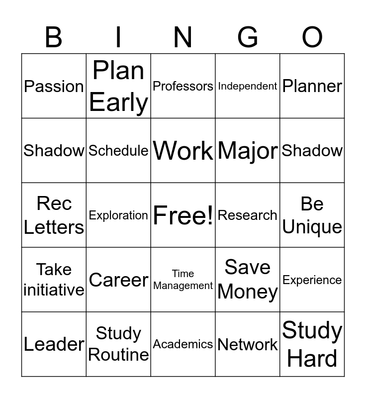 This bingo card has a free space and 24 words: Career, Study Routine, Work, Leader, Planner, Passion, Shadow, Plan Early, Research, Time Management, Major, Rec Letters, Save Money, Experience, Schedule, Network, Be Unique, Professors, Shadow, Exploration, Study Hard, Take initiative, Independent and Academics.