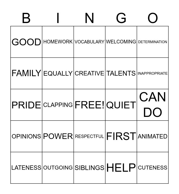 This bingo card has a free space and 39 words: SPEECHLESS, GENEROSITY, HAIRBRUSH, EQUALLY, LATENESS, RESPECTFUL, CREATIVE, ACCENT, DETERMINATION, OPINIONS, CLAPPING, WELCOMING, CUTENESS, CAN DO, QUIET, POWER, ENTHUSIASTIC, GOOD, REFLECTIONS, FIRST, FAMILY, SIBLINGS, TALENTS, INAPPROPRIATE, PRONUNCIATION, GENTLE, DETENTIONS, WISDOM, CONFIDENCE, HOMEWORK, ESSAYS, DETAIL, VOCABULARY, OUTGOING, HELP, SPEAK, ANIMATED, PRIDE and COOPERATE.