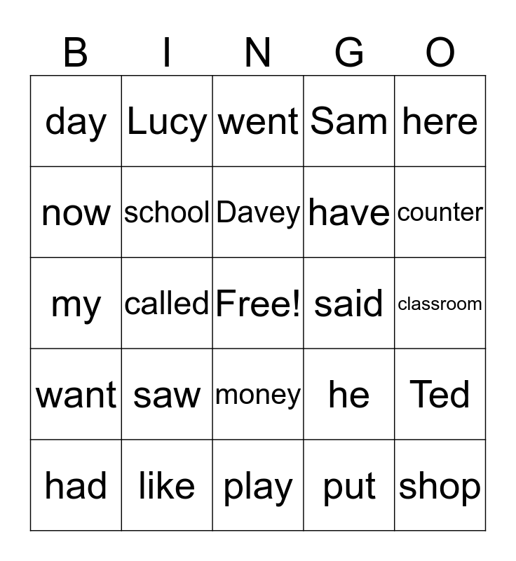 This bingo card has a free space and 29 words: had, bear, called, one, day, went, school, saw, said, like, classroom, shop, play, put, counter, what, money, want, here, my, he, got, have, now, Sam, Lucy, Ted, Davey and she.