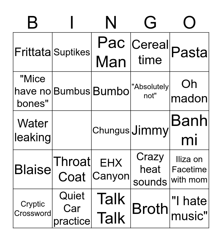 This bingo card has a free space and 23 words: Throat Coat, Quiet Car practice, Bumbo, Cryptic Crossword, Pasta, Frittata, "Mice have no bones", Suptikes, Jimmy, EHX Canyon, "Absolutely not", Water leaking, Crazy heat sounds, Iliza on Facetime with mom, Bumbus, Broth, Banh mi, Pac Man, Oh madon, "I hate music", Blaise, Cereal time and Talk Talk.