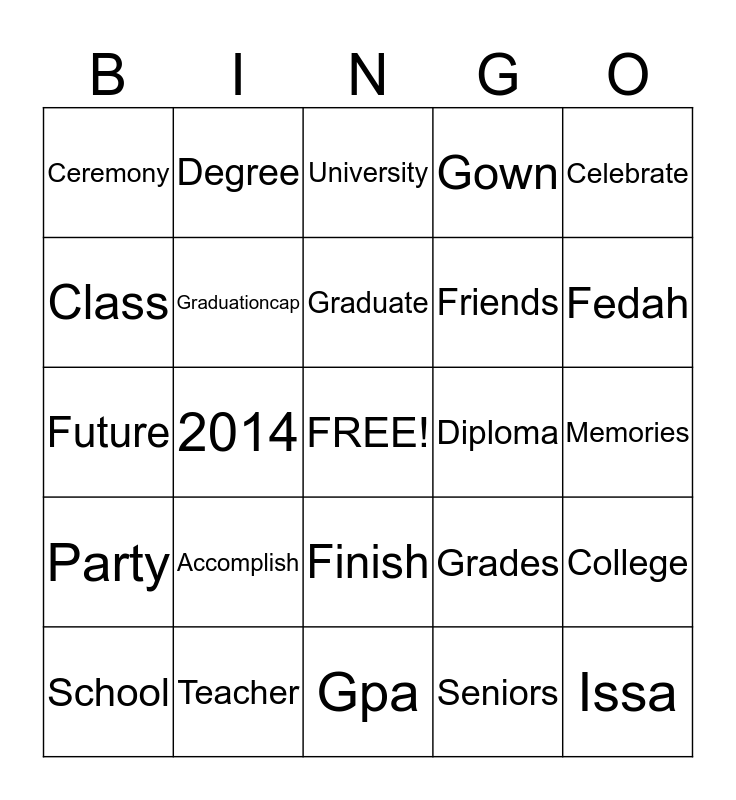 This bingo card has a free space and 24 words: Accomplish, Teacher, Graduate, School, Celebrate, Ceremony, Class, Degree, Diploma, Finish, Friends, Future, Grades, College, Graduationcap, Seniors, Memories, University, Fedah, 2014, Issa, Party, Gown and Gpa.