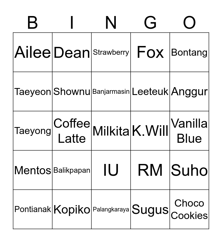 This bingo card has 25 words: Balikpapan, Palangkaraya, Banjarmasin, Pontianak, Bontang, Ailee, Taeyeon, Dean, K.Will, IU, Leeteuk, Taeyong, RM, Suho, Shownu, Choco Cookies, Vanilla Blue, Strawberry, Anggur, Coffee Latte, Milkita, Kopiko, Mentos, Fox and Sugus.