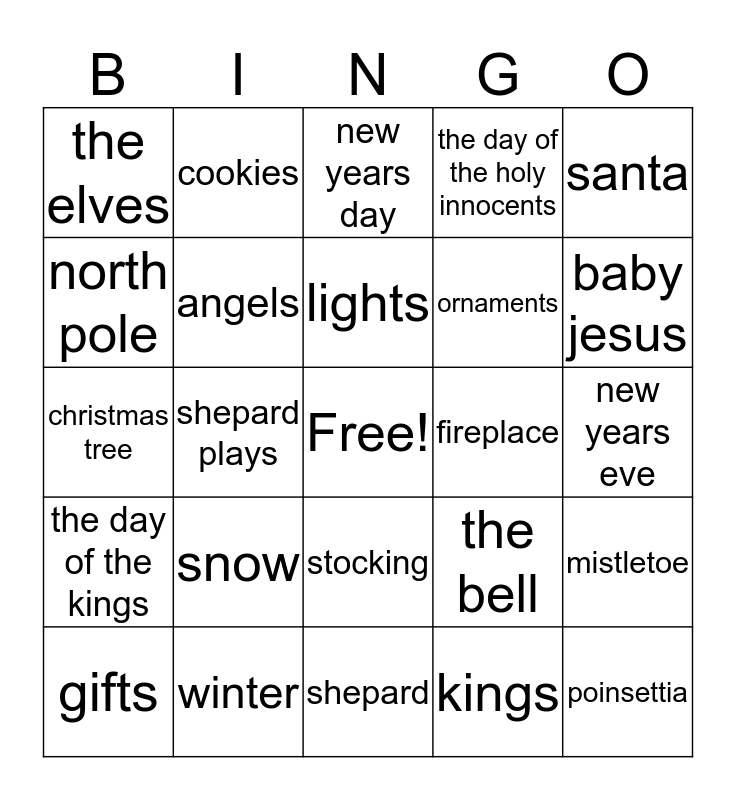 This bingo card has a free space and 24 words: snow, winter, lights, gifts, santa, the elves, north pole, cookies, fireplace, stocking, ornaments, christmas tree, the bell, mistletoe, angels, kings, new years eve, new years day, baby jesus, shepard plays, poinsettia, the day of the kings, the day of the holy innocents and shepard.
