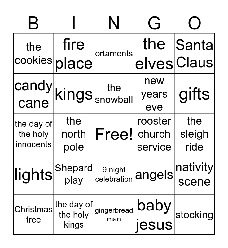 This bingo card has a free space and 24 words: Shepard play, the day of the holy kings, the snowball, Christmas tree, Santa Claus, the cookies, candy cane, fire place, rooster church service, 9 night celebration, new years eve, the day of the holy innocents, angels, nativity scene, kings, baby jesus, the sleigh ride, ortaments, gifts, the north pole, stocking, lights, the elves and gingerbread man.