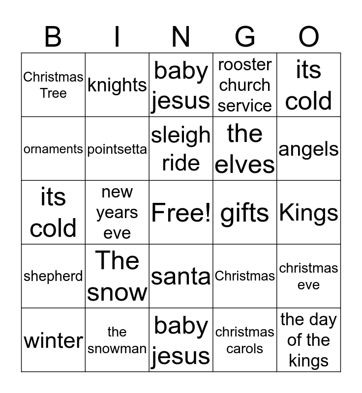 This bingo card has a free space and 24 words: The snow, the snowman, sleigh ride, winter, its cold, Christmas Tree, ornaments, knights, gifts, santa, the elves, its cold, Christmas, christmas eve, pointsetta, christmas carols, Kings, baby jesus, angels, new years eve, the day of the kings, shepherd, rooster church service and baby jesus.