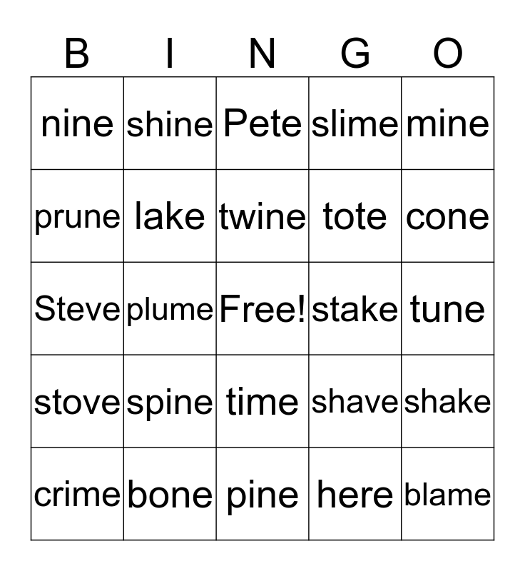 This bingo card has a free space and 29 words: crime, stone, plume, flame, nine, Pete, lake, spine, stake, bone, tune, blame, pine, here, cone, fume, time, stove, mine, Steve, shave, chime, tote, prune, slime, shine, shake, twine and zone.