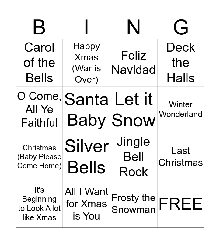This bingo card has 16 words: All I Want for Xmas is You, Last Christmas, Feliz Navidad, Carol of the Bells, Christmas (Baby Please Come Home), Happy Xmas (War is Over), Jingle Bell Rock, Frosty the Snowman, O Come, All Ye Faithful, Santa Baby, It's Beginning to Look A lot like Xmas, Deck the Halls, Silver Bells, Winter Wonderland, Let it Snow and FREE.