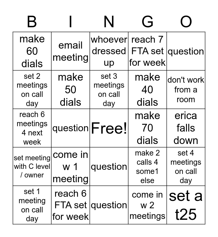 This bingo card has a free space and 24 words: come in w 1 meeting, reach 6 FTA set for week, set 3 meetings on call day, set 1 meeting on call day, question, make 60 dials, set 2 meetings on call day, email meeting, make 70 dials, question, make 40 dials, reach 6 meetings 4 next week, make 2 calls 4 some1 else, set 4 meetings on call day, make 50 dials, come in w 2 meetings, erica falls down, whoever dressed up, don't work from a room, question, set a t25, set meeting with C level / owner, reach 7 FTA set for week and question.
