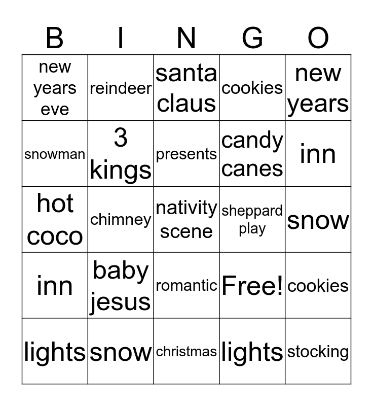 This bingo card has 25 words: baby jesus, christmas, presents, lights, new years, new years eve, snowman, reindeer, sheppard play, romantic, candy canes, hot coco, Free!, cookies, 3 kings, stocking, snow, santa claus, inn, chimney, nativity scene, snow, inn, cookies and lights.