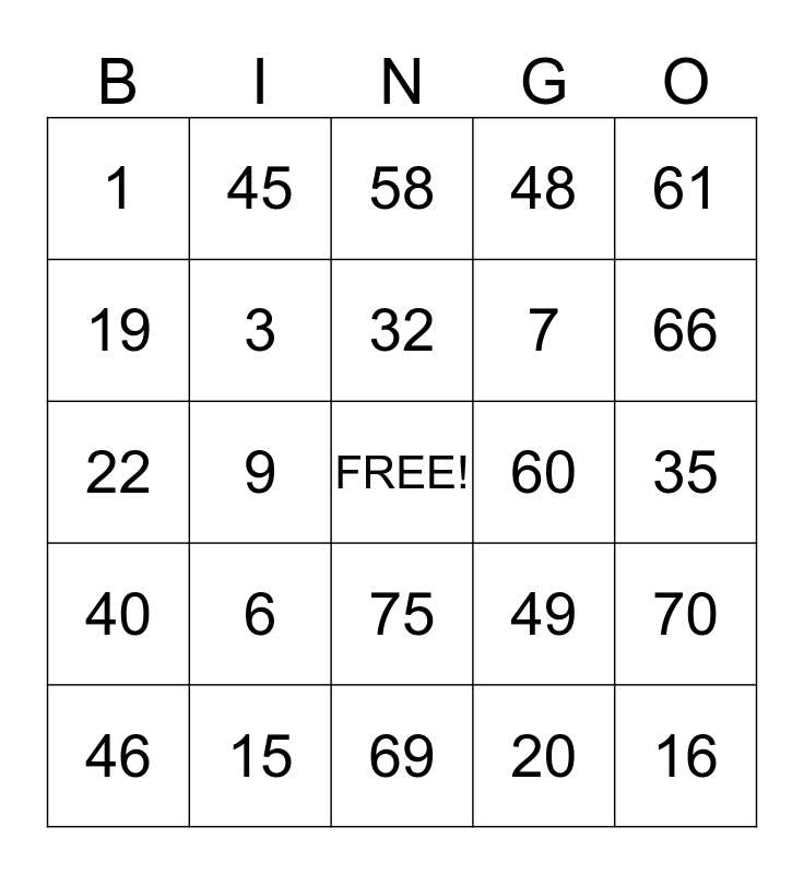 This bingo card has a free space and 24 words: 6, 15, 32, 46, 61, 1, 19, 45, 60, 75, 7, 22, 49, 70, 3, 20, 35, 58, 66, 9, 16, 40, 48 and 69.