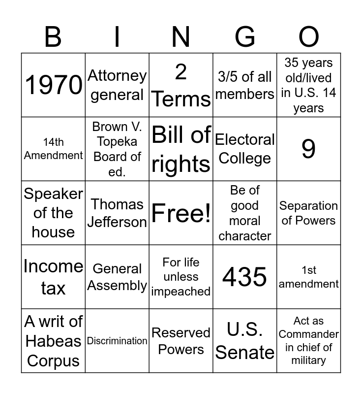 This bingo card has a free space and 24 words: General Assembly, Discrimination, Bill of rights, A writ of Habeas Corpus, 35 years old/lived in U.S. 14 years, 1970, 14th Amendment, Attorney general, Be of good moral character, For life unless impeached, Electoral College, Speaker of the house, 435, 1st amendment, Brown V. Topeka Board of ed., U.S. Senate, Separation of Powers, 2 Terms, 9, Thomas Jefferson, Act as Commander in chief of military, Income tax, 3/5 of all members and Reserved Powers.