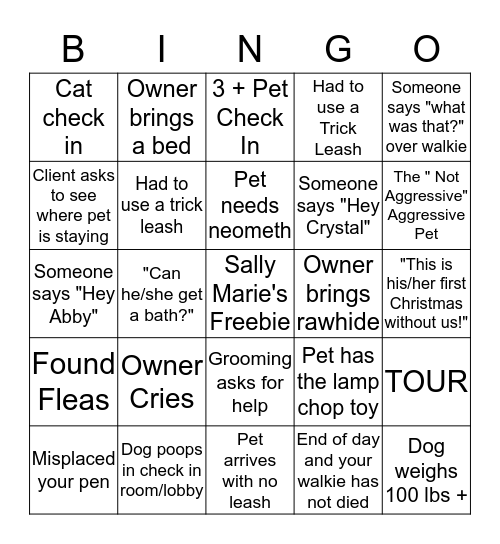 This bingo card has a free space and 24 words: Owner Cries, Dog poops in check in room/lobby, Pet needs neometh, Misplaced your pen, Someone says "what was that?" over walkie, Cat check in, Client asks to see where pet is staying, Owner brings a bed, Owner brings rawhide, Grooming asks for help, Someone says "Hey Crystal", Someone says "Hey Abby", Pet has the lamp chop toy, TOUR, Had to use a trick leash, End of day and your walkie has not died, "This is his/her first Christmas without us!", 3 + Pet Check In, The " Not Aggressive" Aggressive Pet, "Can he/she get a bath?", Dog weighs 100 lbs +, Found Fleas, Had to use a Trick Leash and Pet arrives with no leash.