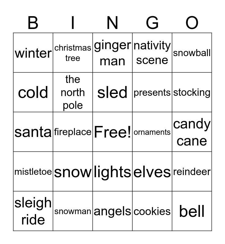 This bingo card has a free space and 24 words: snow, snowman, sled, sleigh ride, snowball, winter, cold, christmas tree, ornaments, lights, presents, santa, elves, reindeer, the north pole, cookies, candy cane, ginger man, stocking, fireplace, bell, mistletoe, nativity scene and angels.