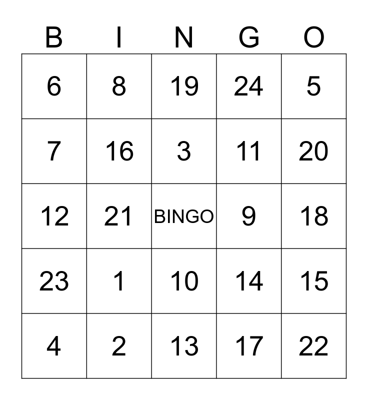 This bingo card has a free space and 24 words: 1, 2, 3, 4, 5, 6, 7, 8, 9, 10, 11, 12, 14, 15, 16, 17, 18, 19, 20, 21, 22, 23, 24 and 13.