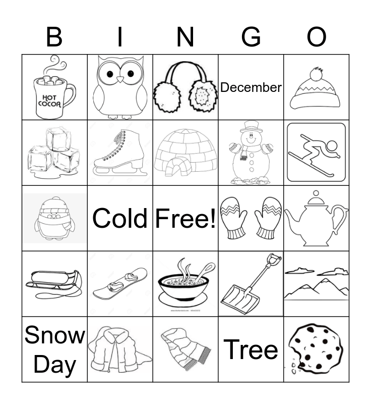 This bingo card has 24 images, a free space and 5 words: Snow Day, Cold, Tree, December and January.