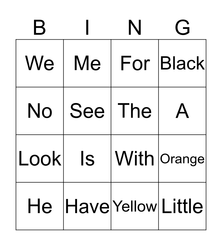 This bingo card has 36 words: Free!, I, Am, The, To, Little, A, Yes, No, Red, Orange, Black, Five, Have, Is, We, My, Like, He, For, Yellow, Green, Blue, Zero, Three, Me, With, She, Look, See, Of, They, You, Purple, Brown and One.