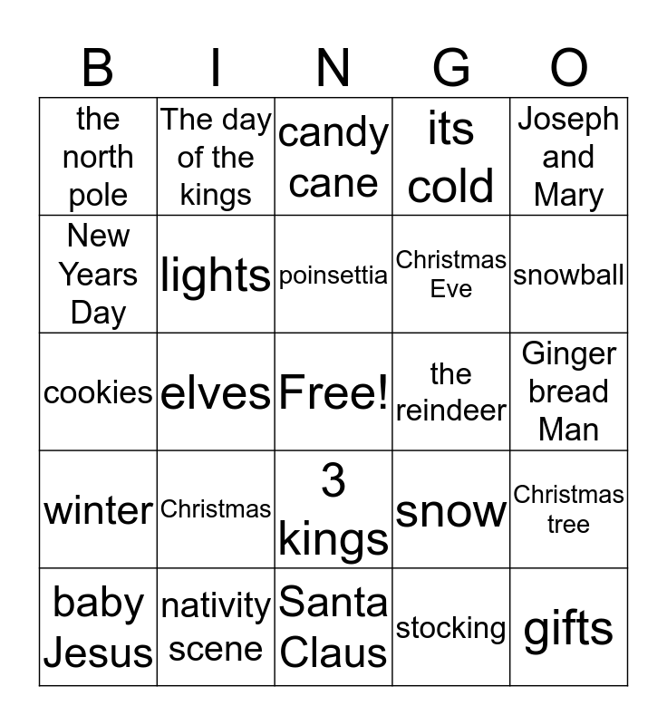 This bingo card has a free space and 24 words: Christmas, nativity scene, poinsettia, baby Jesus, Joseph and Mary, the north pole, New Years Day, The day of the kings, the reindeer, 3 kings, Christmas Eve, cookies, snow, Christmas tree, lights, stocking, Ginger bread Man, candy cane, snowball, elves, gifts, winter, its cold and Santa Claus.