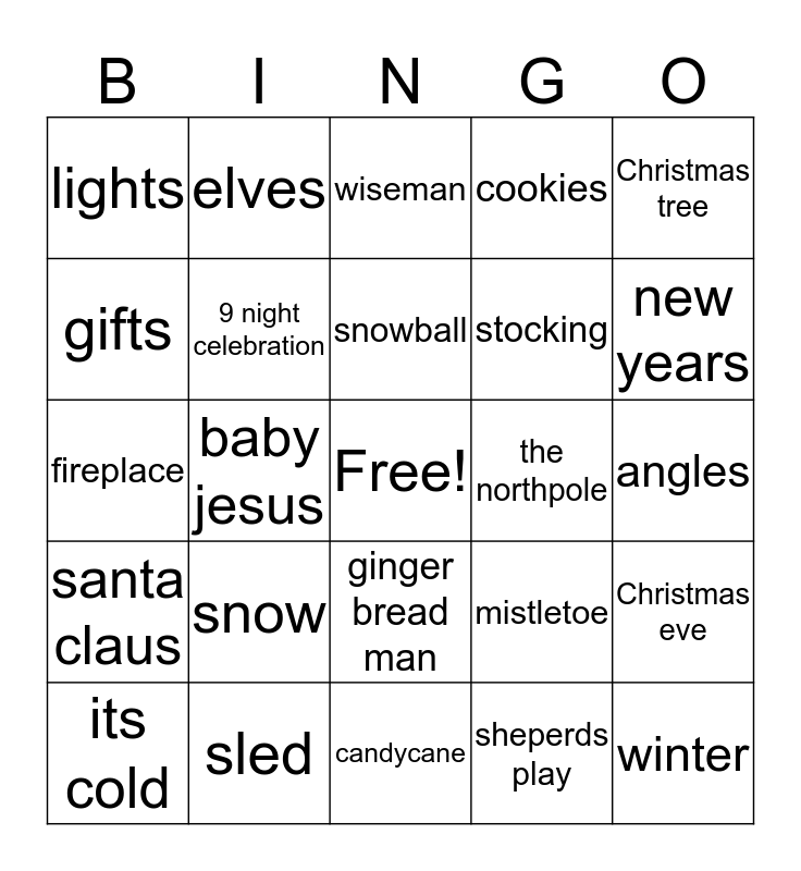 This bingo card has a free space and 24 words: snow, sled, snowball, its cold, Christmas tree, lights, gifts, elves, the northpole, ginger bread man, stocking, fireplace, mistletoe, Christmas eve, 9 night celebration, sheperds play, angles, wiseman, new years, baby jesus, winter, santa claus, cookies and candycane.