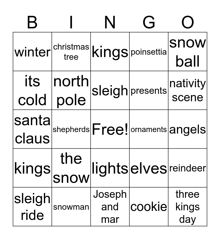 This bingo card has a free space and 24 words: the snow, snowman, sleigh, sleigh ride, snow ball, winter, its cold, christmas tree, ornaments, lights, presents, santa claus, elves, reindeer, north pole, cookie, angels, kings, nativity scene, shepherds, three kings day, kings, poinsettia and Joseph and mar.