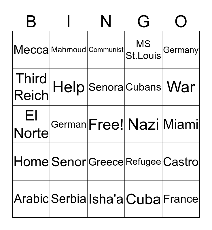 This bingo card has a free space and 34 words: Manana, Cuba, Disaster, Isabel, Home, Help, Germany, Arabic, Mahmoud, Turkey, Senora, Communist, Josef, Islam, Nazi, War, Serbia, El Norte, Senor, Refugee, Greece, UN, Mecca, Miami, Isha'a, France, MS St.Louis, Jews, Cubans, Third Reich, Dachau, German, Castro and Broken.