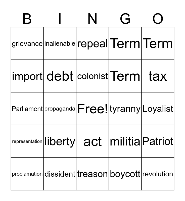This bingo card has a free space and 26 words: act, boycott, colonist, dissident, Term, grievance, import, inalienable, Loyalist, militia, Term, Parliament, Patriot, proclamation, propaganda, Red Coat, Term, representation, repeal, revolution, tax, treason, tyranny, liberty, debt and oppress.