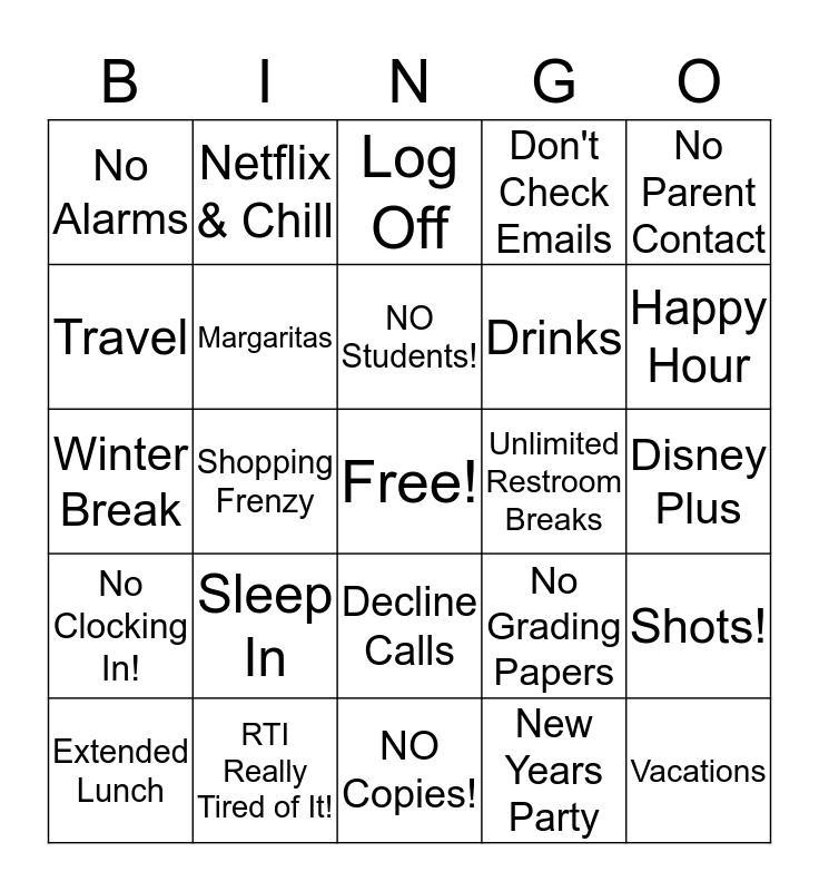 This bingo card has a free space and 24 words: Sleep In, RTI Really Tired of It!, NO Students!, Extended Lunch, No Parent Contact, No Alarms, Travel, Netflix & Chill, Unlimited Restroom Breaks, Decline Calls, Drinks, Winter Break, No Grading Papers, Shots!, Margaritas, New Years Party, Disney Plus, Log Off, Happy Hour, Shopping Frenzy, Vacations, No Clocking In!, Don't Check Emails and NO Copies!.